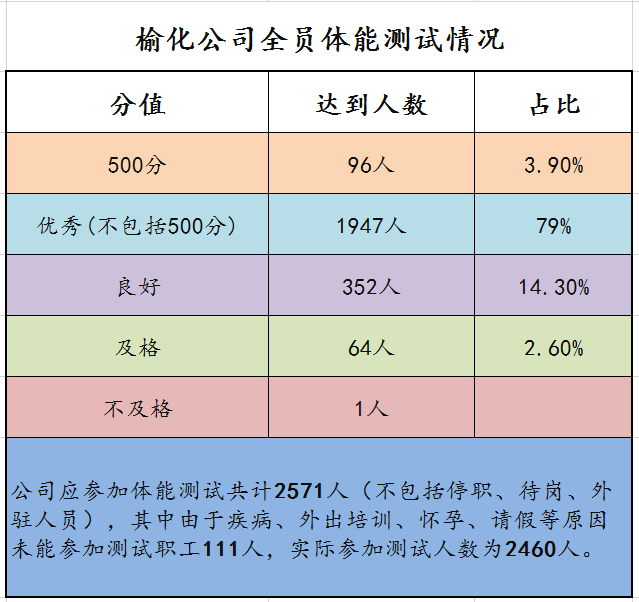 為準確反映員工的體能狀況,公司嚴格按照《國家體育鍛煉標準》進行測試,特邀縣體育運動中心專業(yè)人員幫助指導測試工作,保障了測試成績科學準確、公平公正。