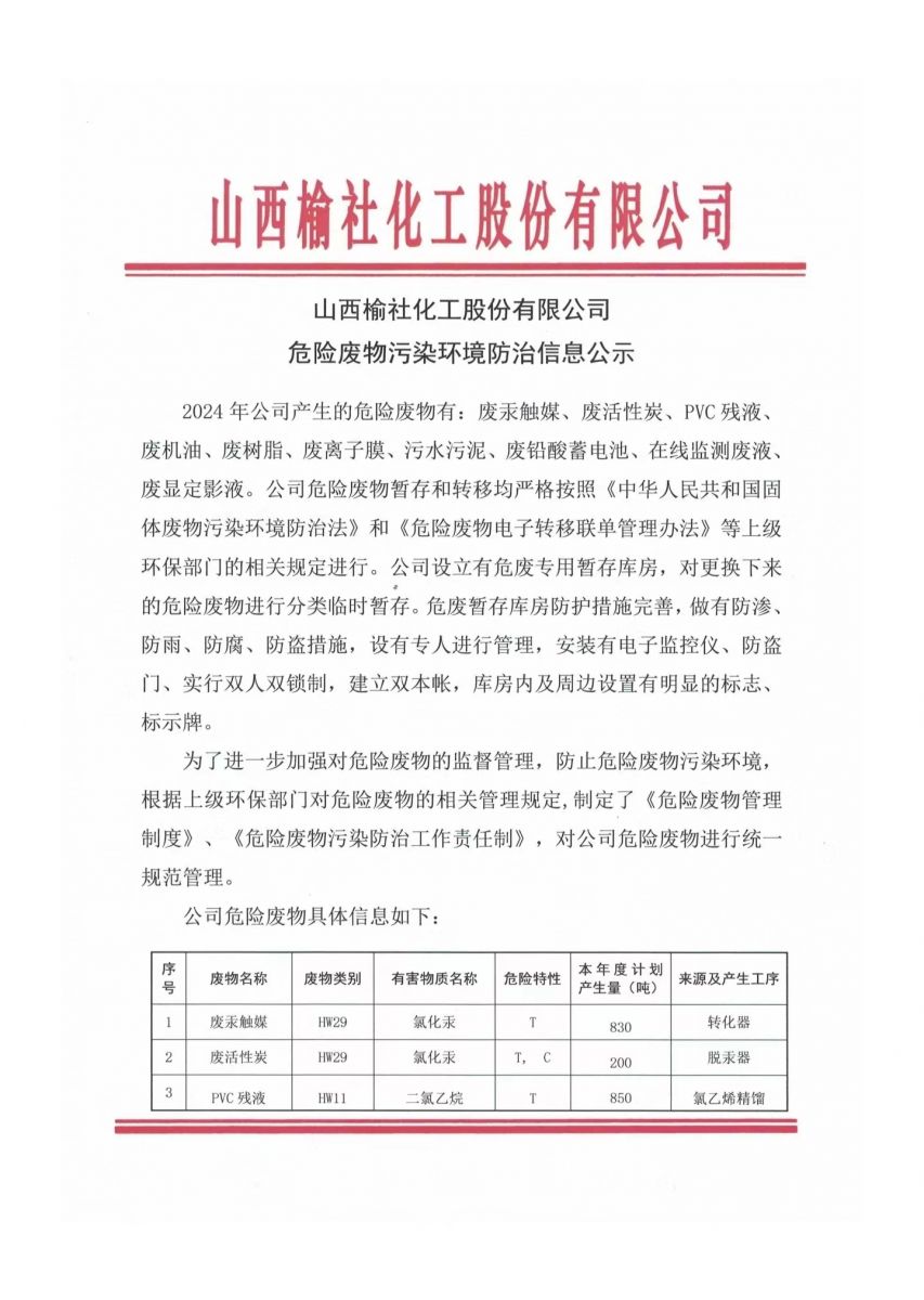 山西榆社化工股份有限公司危險廢物污染環(huán)境防治信息公示