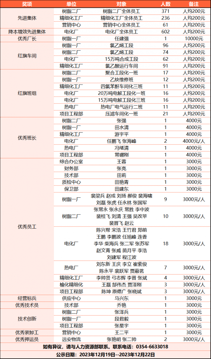 依據(jù)《榆化公司2023年度表彰獎(jiǎng)勵(lì)的通知》要求,結(jié)合各單位推選出的先進(jìn)個(gè)人,2023年度共評(píng)選出先進(jìn)集體3個(gè)、降本增效先進(jìn)集體1個(gè)、優(yōu)秀廠長1名、紅旗車間4個(gè)、紅旗班組7個(gè)、優(yōu)秀班長7名、優(yōu)秀員工59名、經(jīng)營標(biāo)兵1名、優(yōu)秀技術(shù)員1名、技術(shù)創(chuàng)新3名、優(yōu)秀裝卸工1名、優(yōu)秀押運(yùn)員2名。