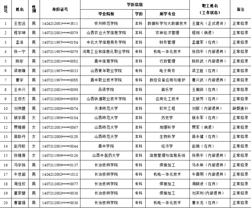 根據《山西榆社化工股份有限公司2024年內部招聘公告》要求,經發(fā)布公告、報名初審、筆試、面試、資格復審、體檢等程序,確定20人為公司內部(職工子女)招聘擬錄用人員,現(xiàn)將擬錄用人員情況予以公示。(具體名單詳見附件)