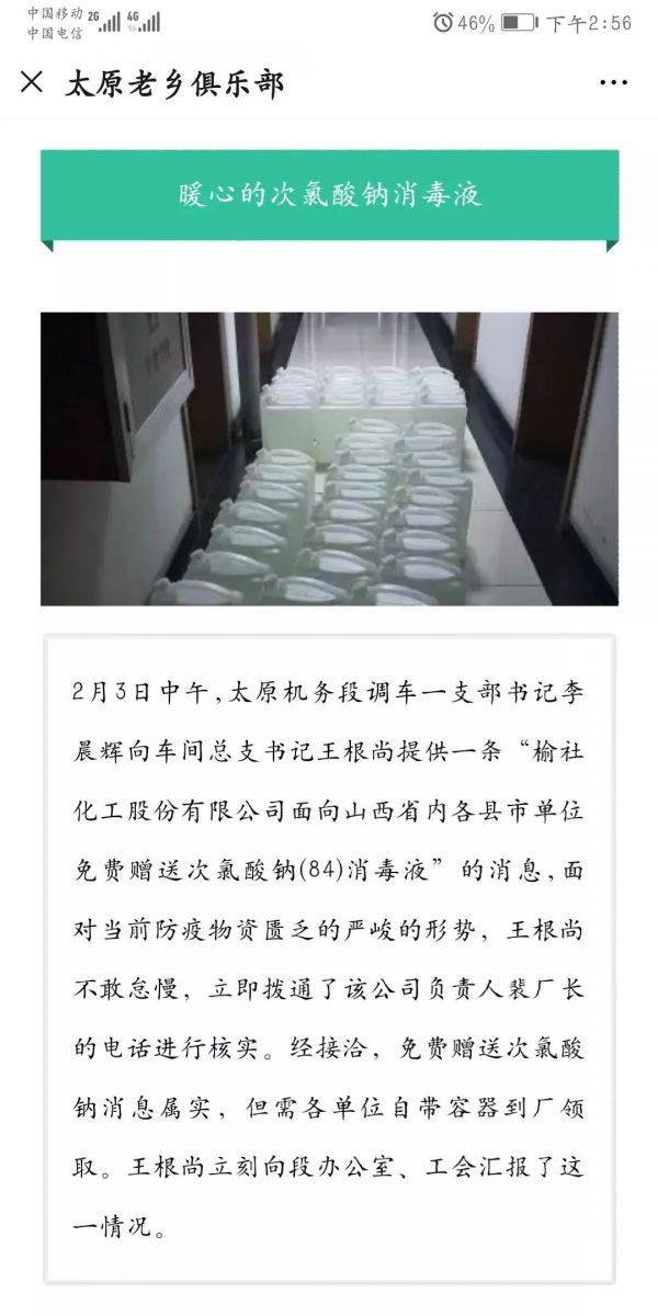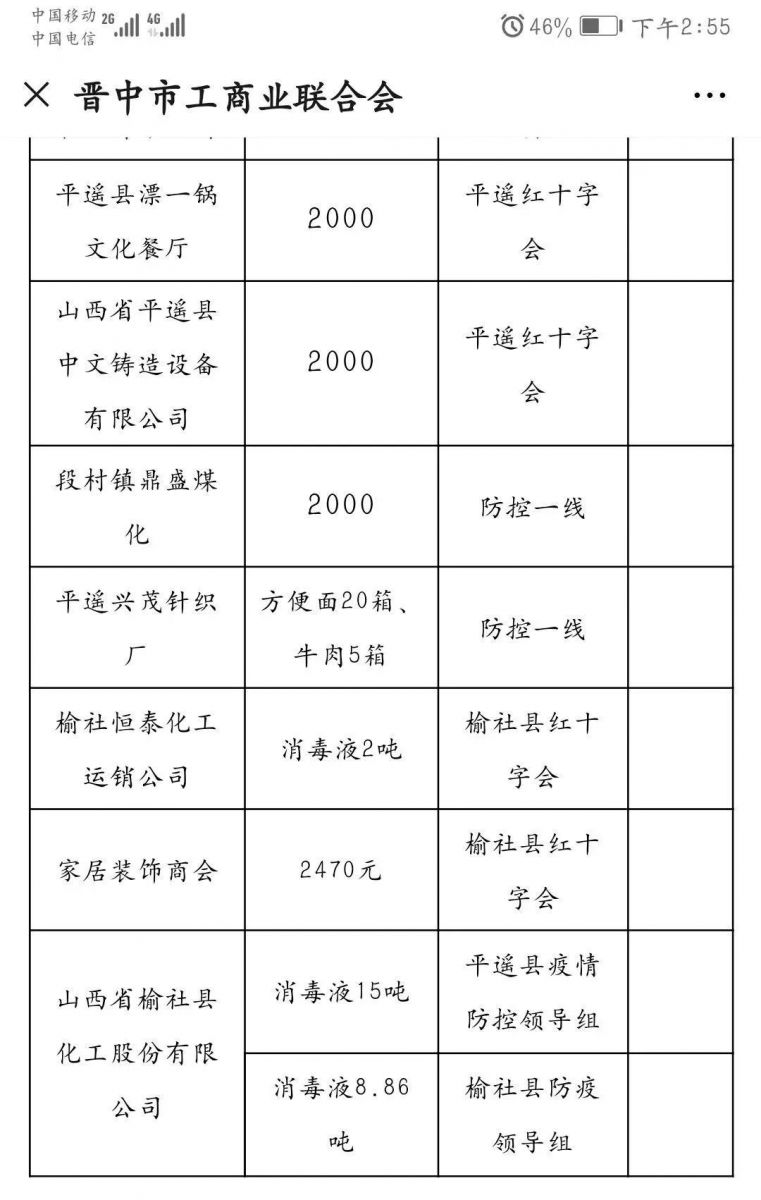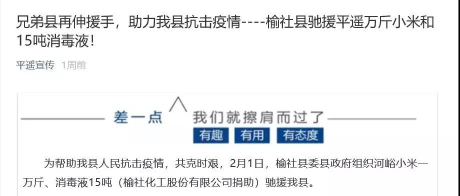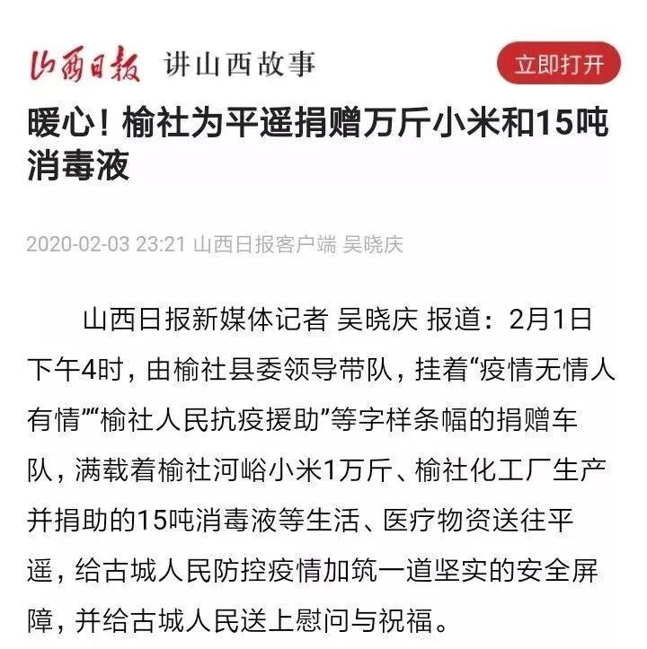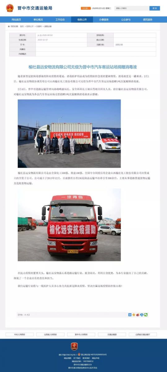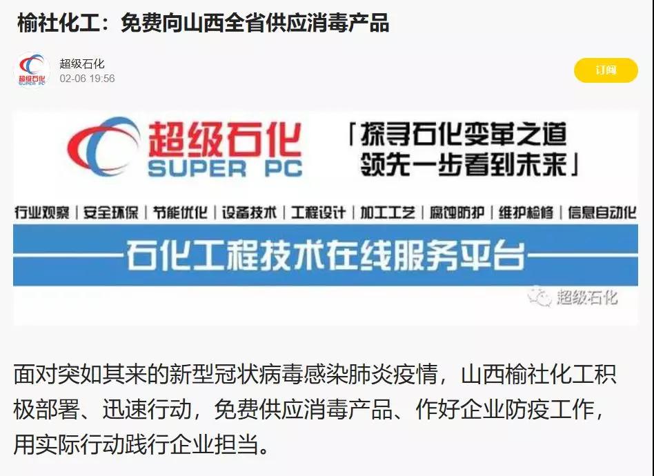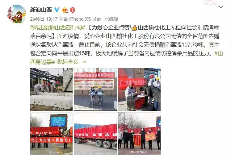 疫情無情,人間有愛。榆化公司于1月31日——2月11日共計(jì)為全省范圍內(nèi)357家單位捐贈(zèng)次氯酸鈉消毒液163.545噸。社會(huì)各界紛紛對(duì)榆化所為表示感謝,晉中市衛(wèi)生健康委員會(huì)、山西日?qǐng)?bào)、晉中市交通運(yùn)輸局、晉中市工商聯(lián)合會(huì)、新浪山西官媒紛紛發(fā)文對(duì)公司做出的義舉表示肯定。