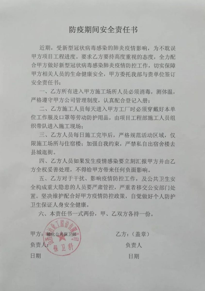 嚴格管控進入廠區(qū)外來施工人員,最大限度減少人員流動;我公司項目建設逐步按計劃推進,給公司防疫工作帶來難度,保衛(wèi)部迅速向施工單位下發(fā)緊急通知,并逐一給施工單位宣講防疫期的工作要求,認真與施工單位負責人簽定安全責任書;同時在施工單位住宿區(qū)大門外設置管理關卡,專人值守,對外來人員實行管制,進出時必須消毒測體溫,登記備案。