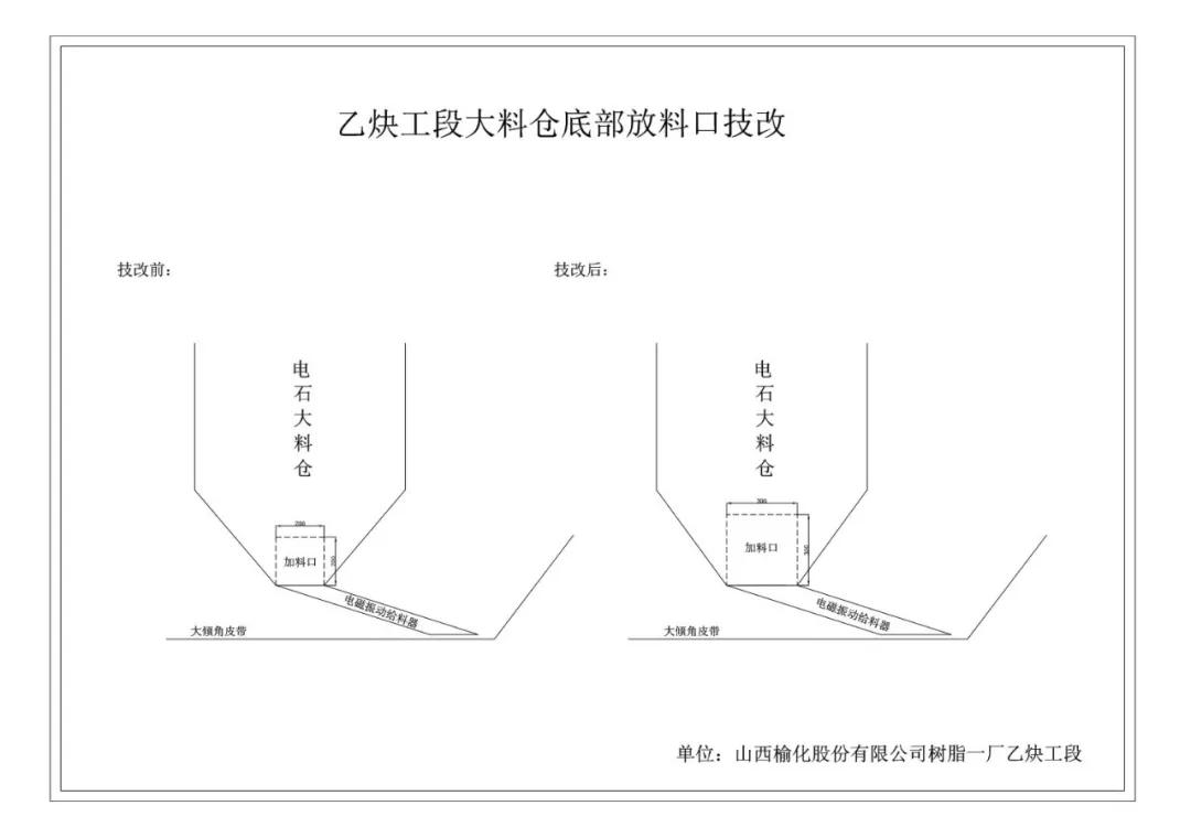 大料倉放料口技改后工藝條件得到優(yōu)化,大料倉底出料口的增大,電石下料均勻,提高下料速度,減少皮帶空轉(zhuǎn)磨損,減輕了員工勞動強度,減少生產(chǎn)影響,消除安全隱患,保證生產(chǎn)穩(wěn)定運行。(董利軍)