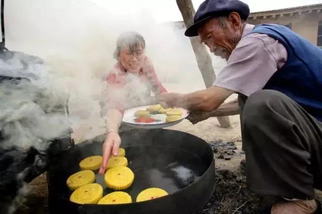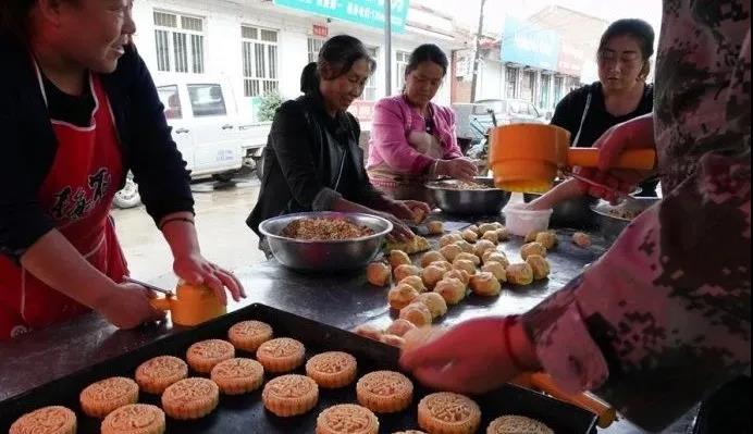 只見一個阿姨把包好餡的胚子放在案板上,另一個阿姨拿起月餅胚子壓在模子里,均勻按實,就在那案板上一磕,“啪”的一聲脆響,一個活脫脫的月餅就掉在案板上了。不一會功夫案板上就整齊地排滿了月餅胚子。剩下的事就是上爐烤了,看火的母親相當(dāng)有經(jīng)驗,她不僅要先在鏊子上慢慢烤,烤的半熟時還要拿下來放到爐膛里烤,而且隨時用心看著,稍不注意就會烤焦。隨著一聲聲清脆的啪啪聲和阿姨們快活的聊天聲,一個個月餅就做好了,小孩們總會在旁邊得到些賞賜,把一些烤的有點糊的月餅嘗嘗鮮,更重要的是每家要烤一個大大的“假月餅”。