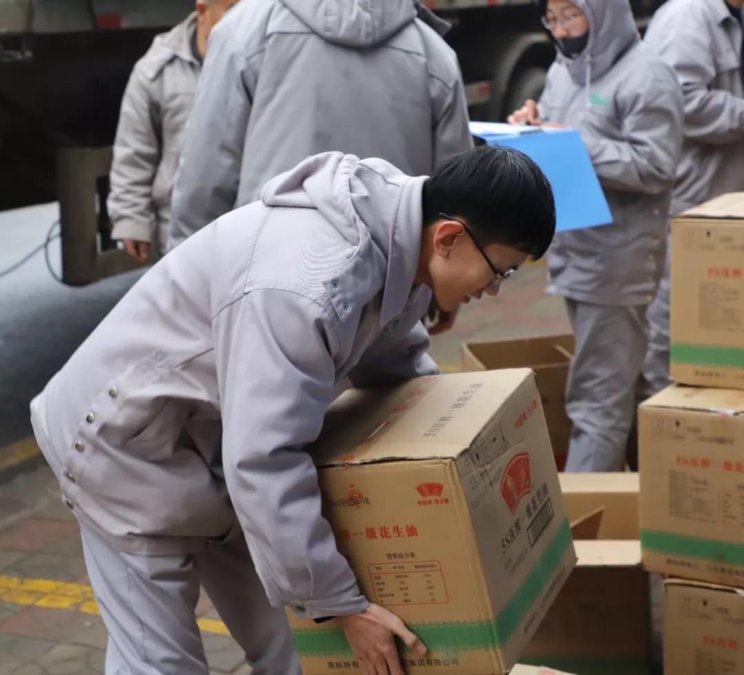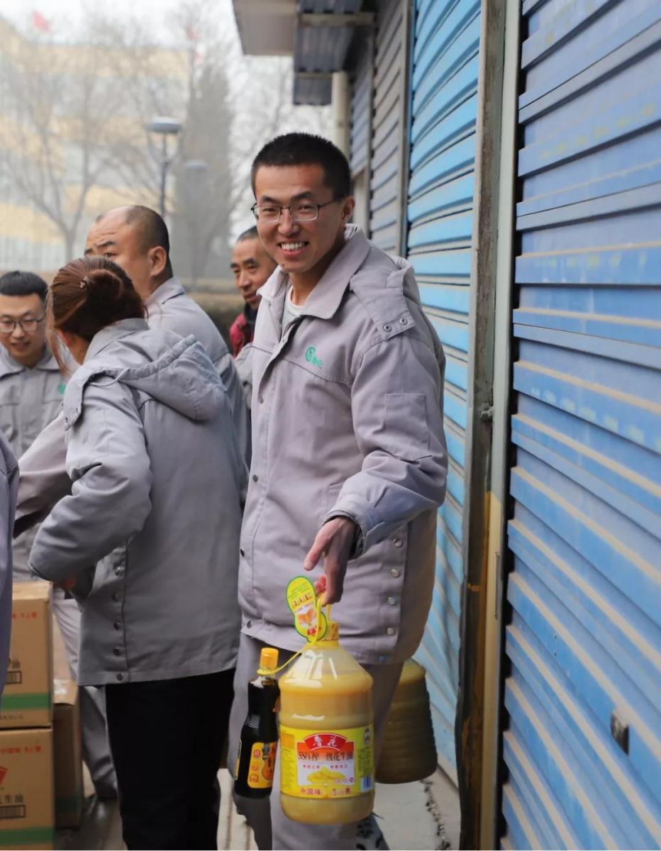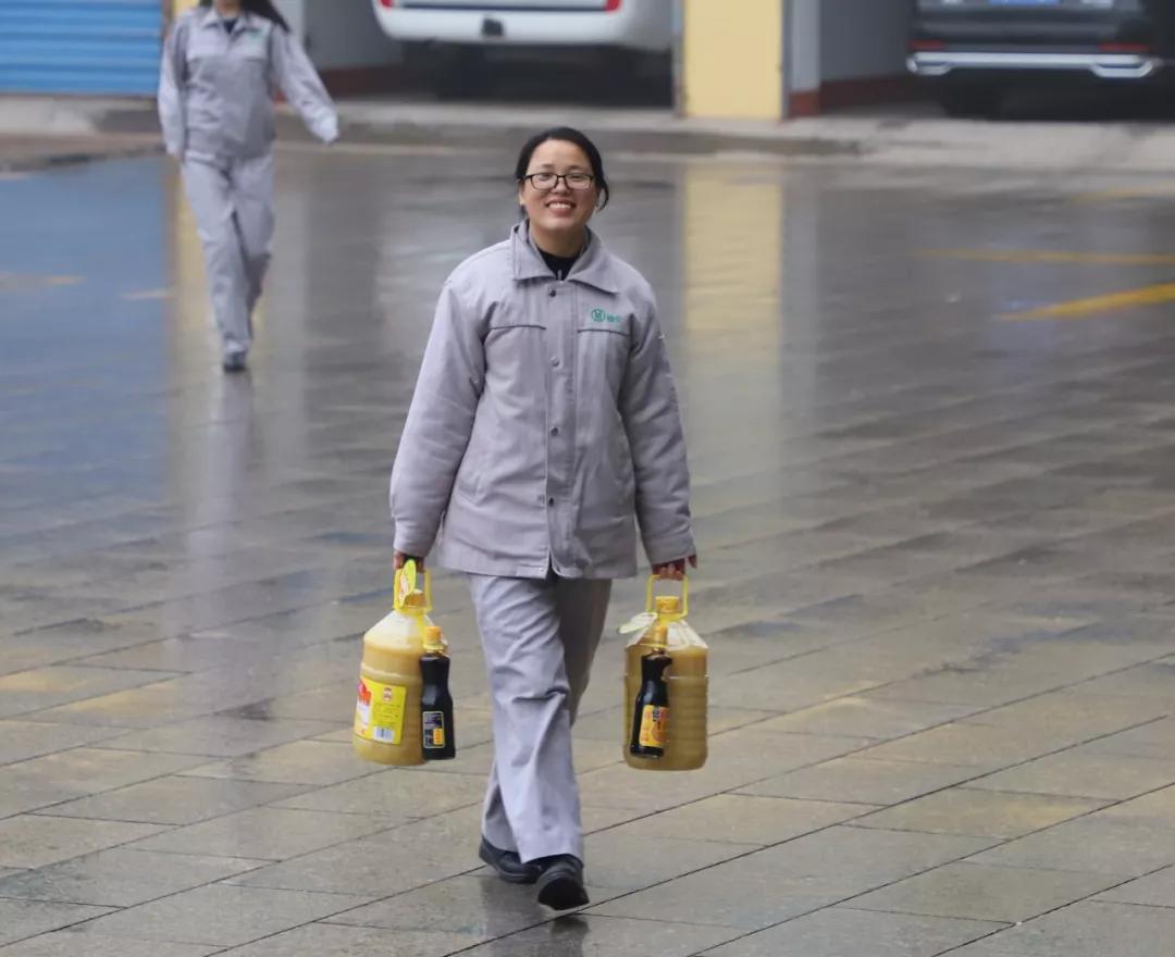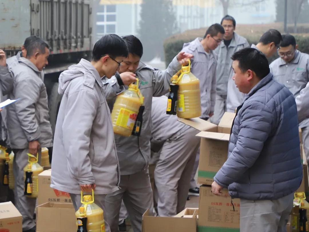 天氣雖然寒冷,但是福利分發(fā)現(xiàn)場熱火朝天,各部門人員配合默契,井然有序,一桶桶承載著公司關(guān)愛的食用油傳遞到員工手中。