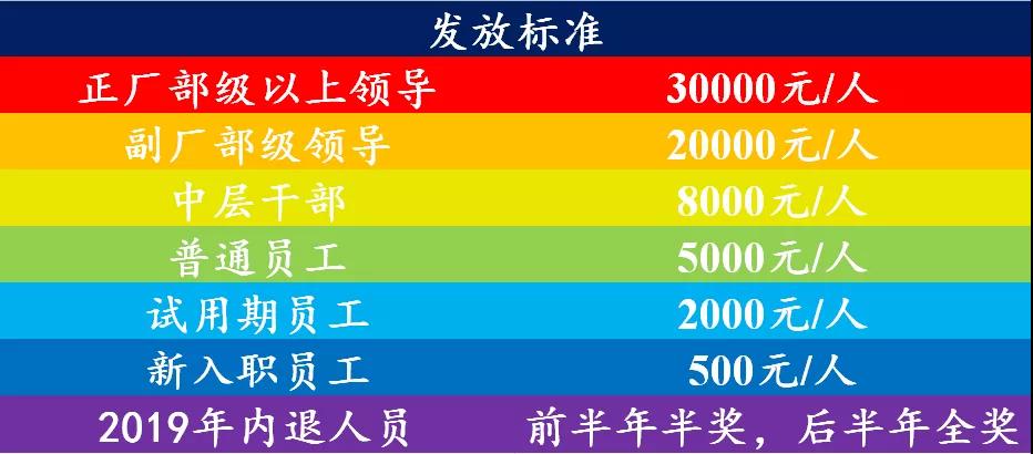 歲末將至,為激勵員工的工作熱情和積極性,在圓滿完成2019年度生產(chǎn)經(jīng)營目標(biāo)任務(wù)的同時,讓員工共享企業(yè)經(jīng)營成果,結(jié)合公司的實際情況,經(jīng)公司董事會、監(jiān)事會、經(jīng)理層研究,制定2019年度年終獎發(fā)放標(biāo)準(zhǔn)。