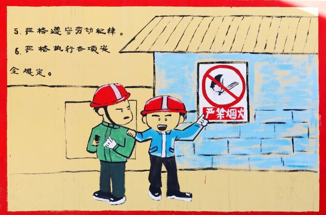圍墻上、標示牌上,可愛的工友們徒手繪就了一幅幅生動、形象的宣傳畫,書寫了一行行充滿朝氣與活力的宣傳標語,畫里畫外、字里行間,是關(guān)切、是叮嚀、是警示、是公司的關(guān)懷、是家人的期盼。