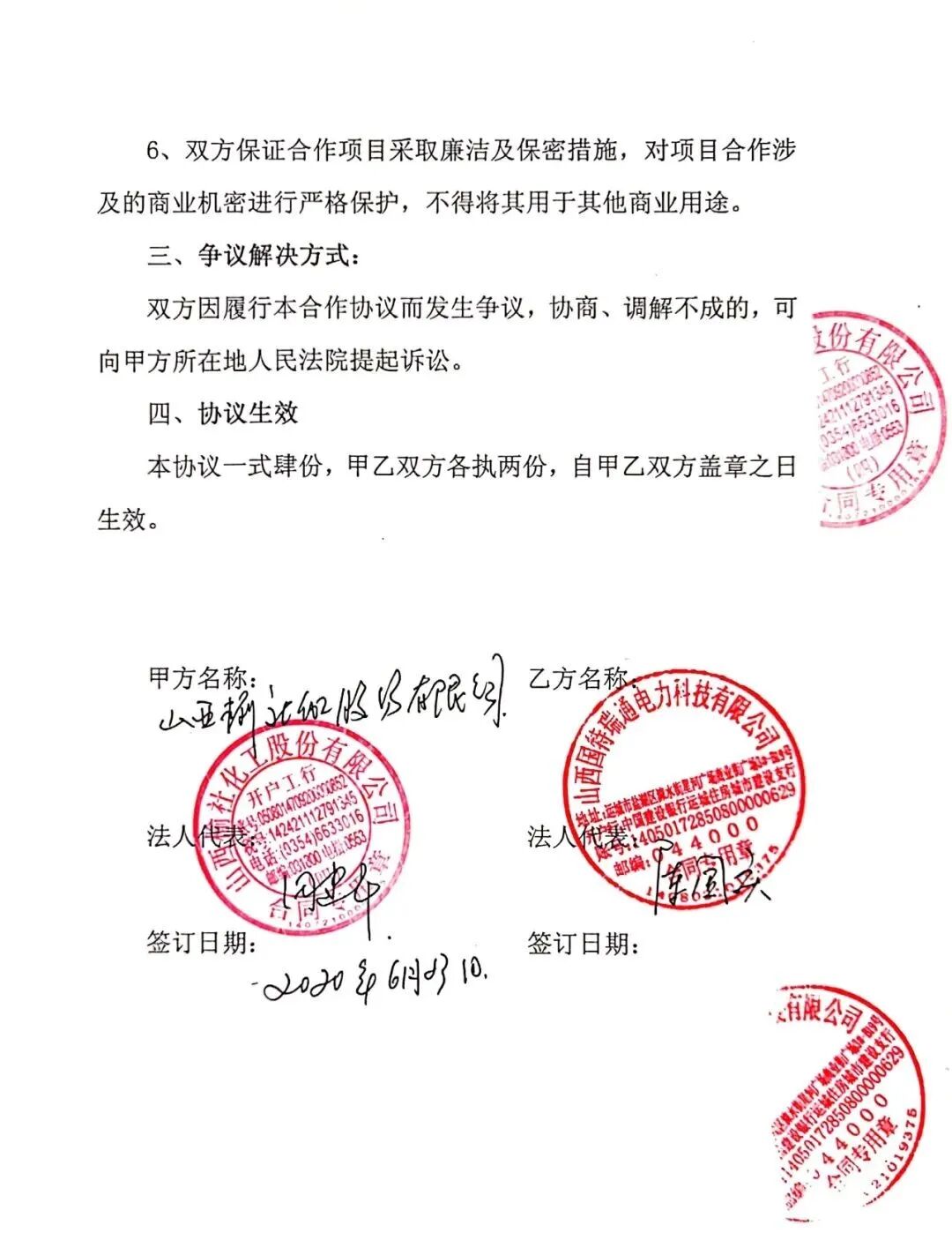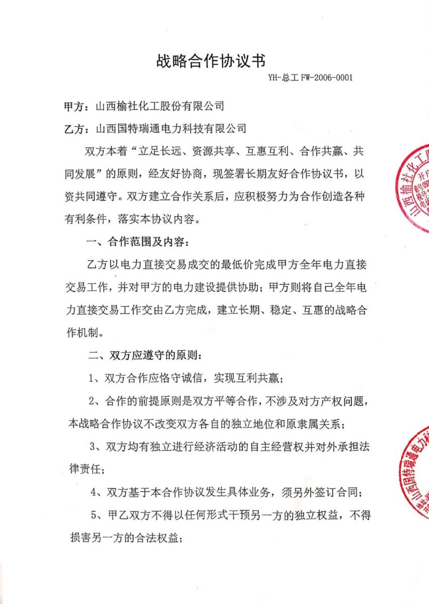合約的主要內(nèi)容為山西國(guó)特瑞通電力科技有限公司以電力直接交易成交的最低價(jià)完成我公司全年電力直接交易工作,并對(duì)我公司的電力建設(shè)提供協(xié)助;我公司則將自己全年電力直接交易工作交由山西國(guó)特瑞通電力科技有限公司,建立長(zhǎng)期、穩(wěn)定、互惠的戰(zhàn)略合作機(jī)制。
