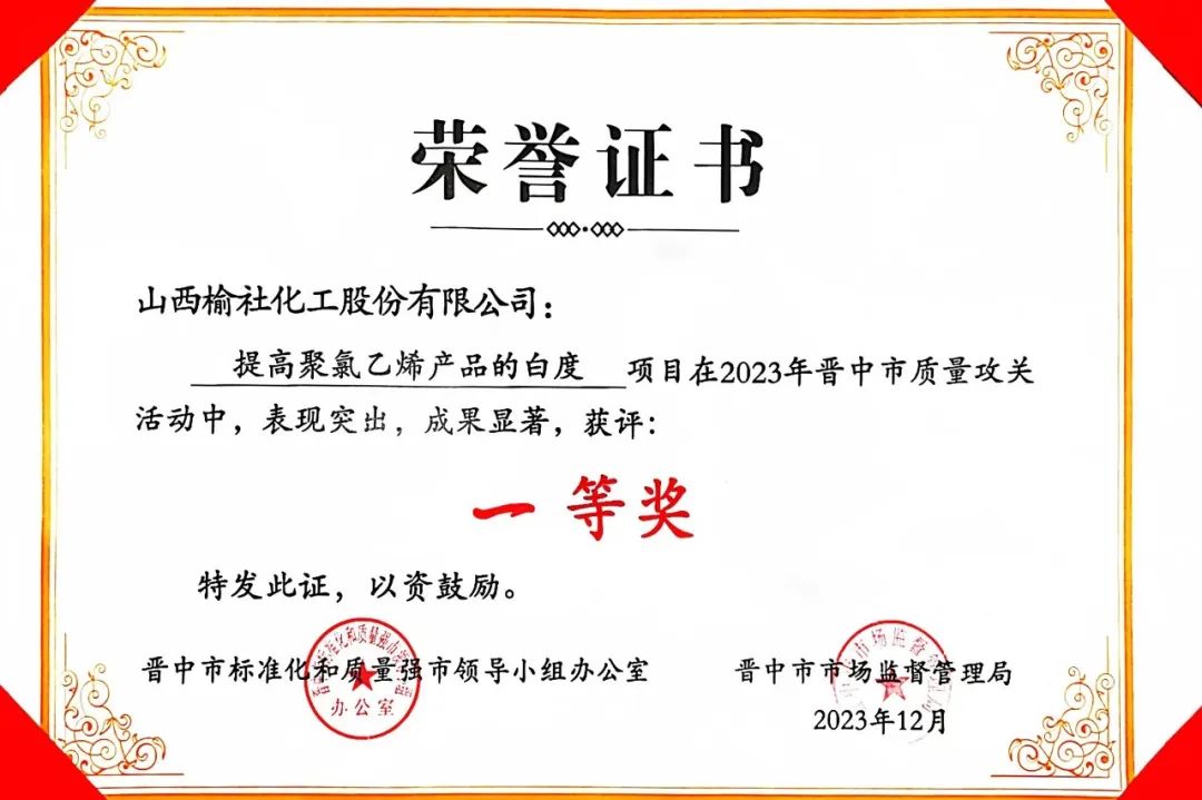 12月28日,在晉中市市場監(jiān)督管理局主辦的2023年晉中市重點(diǎn)質(zhì)量攻關(guān)成果會(huì)上,公司“提高聚氯乙烯產(chǎn)品的白度”項(xiàng)目獲得2023年晉中市質(zhì)量攻關(guān)一等獎(jiǎng)榮譽(yù)。