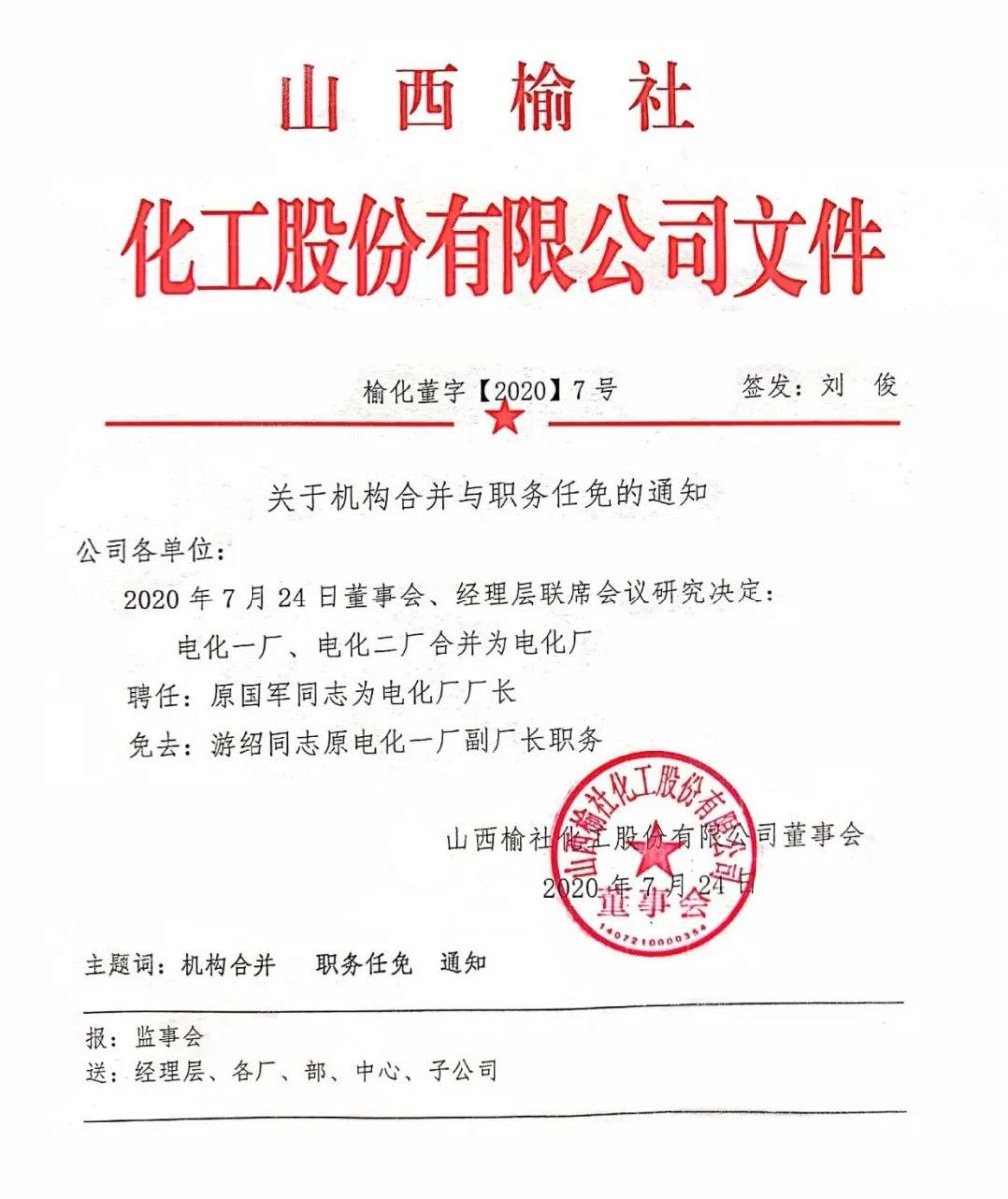 7月24日,公司召開(kāi)董事會(huì)、經(jīng)理層聯(lián)席會(huì)議,副廠部級(jí)以上領(lǐng)導(dǎo)參加會(huì)議。會(huì)議通報(bào)了電化一廠副廠長(zhǎng)游紹在電化一廠調(diào)度選聘工作中,違背公開(kāi)、公平、公正的原則,未能按公司制度嚴(yán)格進(jìn)行民主測(cè)評(píng),破壞了公司風(fēng)清氣正的選人用人環(huán)境,影響極其惡劣,決定免去游紹同志原電化一廠副廠長(zhǎng)職務(wù)。為優(yōu)化管理結(jié)構(gòu),提高管理效率,會(huì)議研究決定將電化一廠與電化二廠合并為電化廠,聘任原國(guó)軍同志為電化廠廠長(zhǎng)。