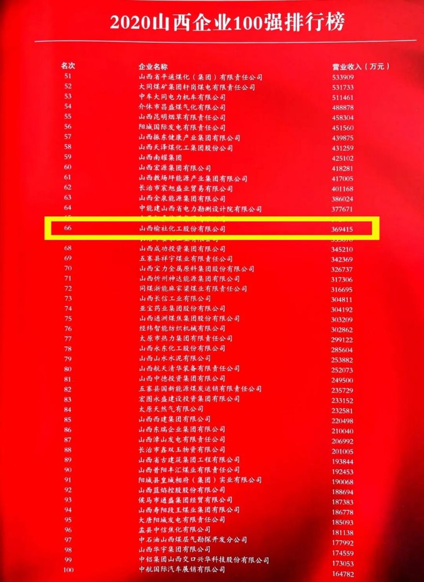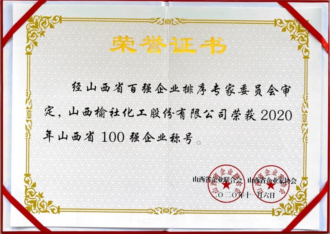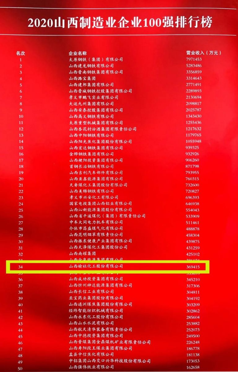 山西企聯(lián)攜手山西財(cái)經(jīng)大學(xué),連續(xù)第17年向社會(huì)發(fā)布“山西企業(yè)100強(qiáng)排行榜”。同時(shí)發(fā)布《山西企業(yè)100強(qiáng)(年度)發(fā)展報(bào)告》。山西企業(yè)百強(qiáng)榜為綜合100強(qiáng),制造業(yè)100強(qiáng)和服務(wù)業(yè)100強(qiáng)。2020山西企業(yè)100強(qiáng)營業(yè)收入總額20149.47億元,較上年提高7.7%,其中營業(yè)收入上千億的企業(yè)7家,入圍門檻16.48億元,比上年提高1.05億元,增幅6.8%。平均資產(chǎn)總額較上年增長7.46%。經(jīng)山西省百強(qiáng)企業(yè)排序?qū)<椅瘑T會(huì)審定,山西榆社化工股份有限公司榮獲2019年度功勛企業(yè)、2020年山西省100強(qiáng)企業(yè)稱號、2020年山西省制造業(yè)100強(qiáng)企業(yè)稱號。
