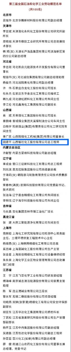 1月15日,第三屆全國(guó)石油和化學(xué)工業(yè)先進(jìn)集體、勞動(dòng)模范和先進(jìn)工作者表彰大會(huì)采用線上線下相結(jié)合的方式在京召開(kāi)。會(huì)上,人力資源和社會(huì)保障部、中國(guó)石油和化學(xué)工業(yè)聯(lián)合會(huì)表彰了81個(gè)單位“全國(guó)石油和化學(xué)工業(yè)先進(jìn)集體”、105名“全國(guó)石油和化學(xué)工業(yè)勞動(dòng)模范”、10名“全國(guó)石油和化學(xué)工業(yè)先進(jìn)工作者”。公司總工程師田建平被授予“全國(guó)石油和化學(xué)工業(yè)勞動(dòng)模范”稱號(hào),享受省部級(jí)勞模待遇。
