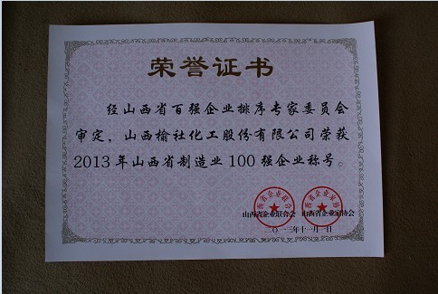 2013年11月1日公司喜獲“2013年山西省100強企業(yè)”“2013年山西省制造業(yè)100強企業(yè)稱號”兩項殊榮。