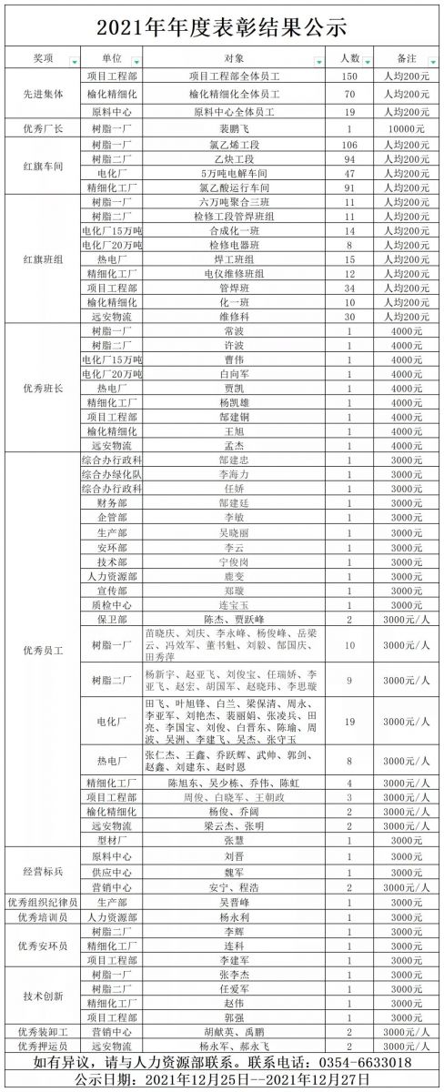 結(jié)合各單位推選出的先進個人,2021年度共計表彰先進集體3個,紅旗車間4個,紅旗班組9個,先進個人98名。