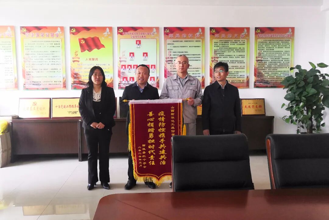 4月14日上午,副縣長、縣紅十字會(huì)會(huì)長溫德偉,縣衛(wèi)健局黨組書記、局長張永明一行代表榆社縣政府向我公司贈(zèng)予“疫情防控?cái)y手共建共治,善心捐贈(zèng)勇?lián)鷷r(shí)代責(zé)任”的錦旗,對(duì)公司在疫情防控期間的義舉表示肯定和贊揚(yáng)。