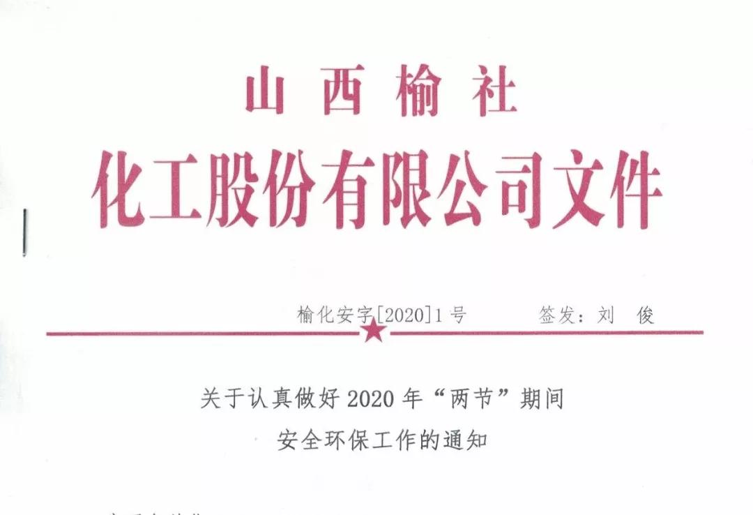 2020年元旦、春節(jié)即將來臨,為貫徹落實全國、全省安全生產工作會議精神,切實加強今冬明春安全生產工作,確保“兩節(jié)”期間生產安全及職工生活穩(wěn)定,公司特下發(fā)“兩節(jié)”期間認真做好安全環(huán)保工作的通知。