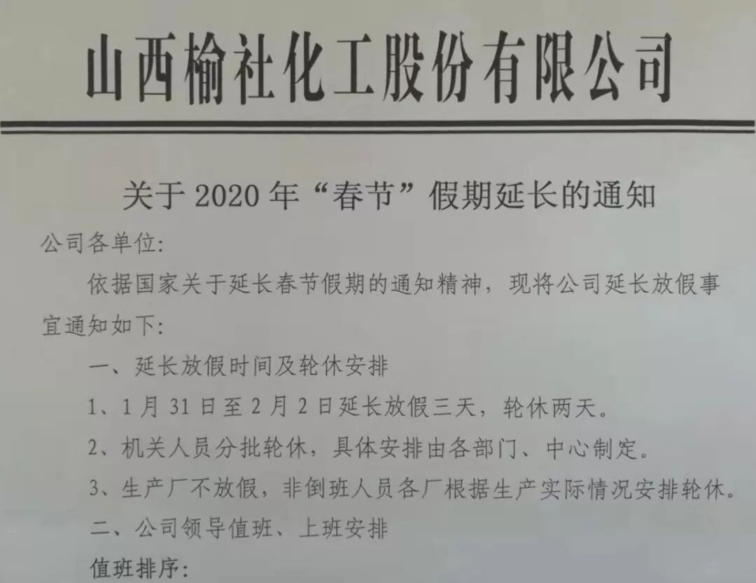對員工春節(jié)假期延長、人員隔離、員工上班等做出具體要求:春節(jié)假期延長至2月2日;疫情期間與武漢人員有往來者,自我隔離14天;建立近一個月內(nèi)往來武漢人員登記跟蹤臺賬,同時對生產(chǎn)廠區(qū)、辦公區(qū)、遠安物流運輸車輛和外來司機等進出情況進行詳細登記,并對春節(jié)期間值班人員進行每日體溫檢測并記錄在冊。