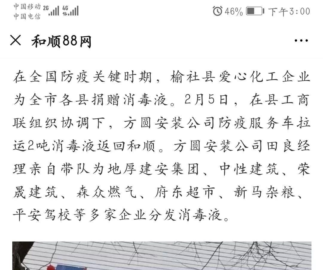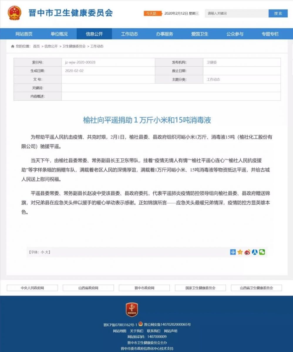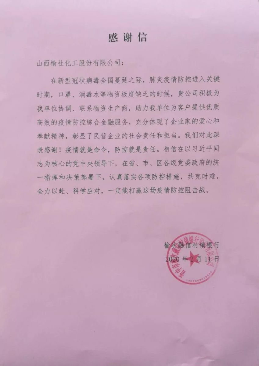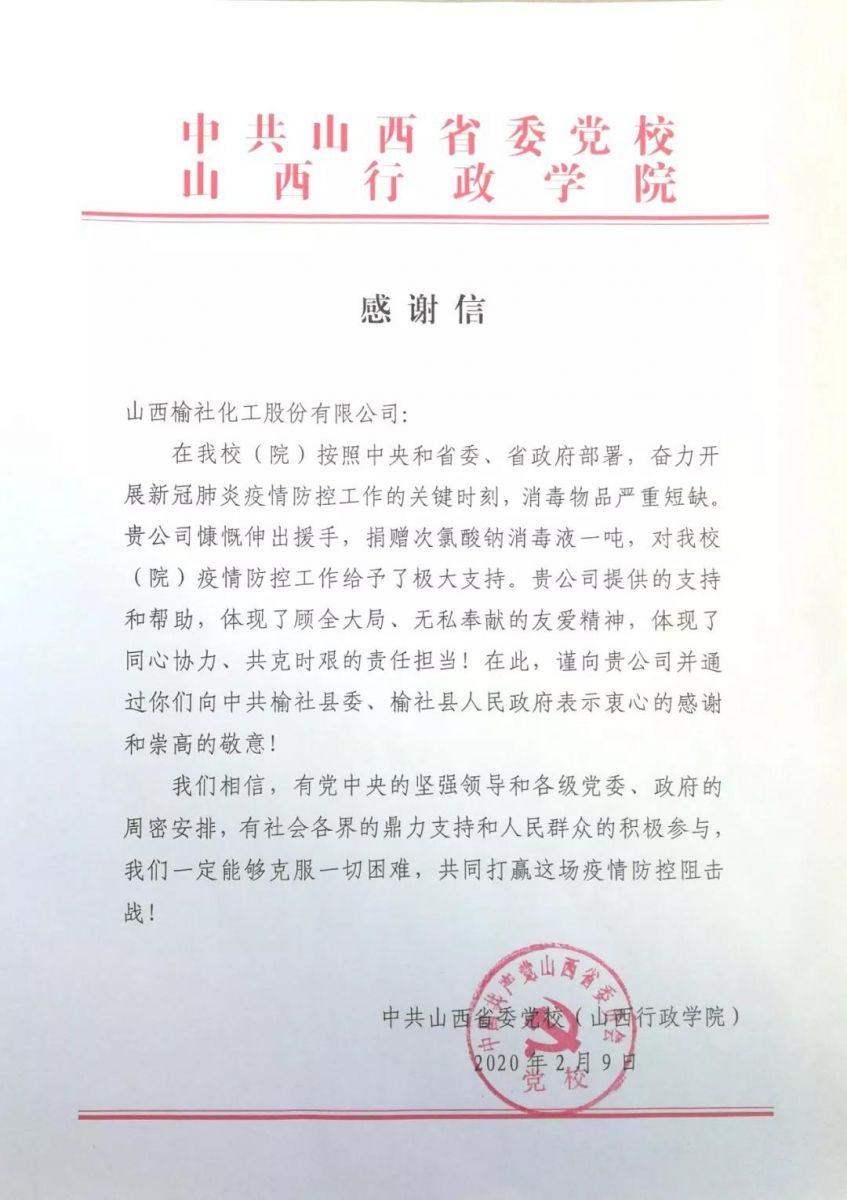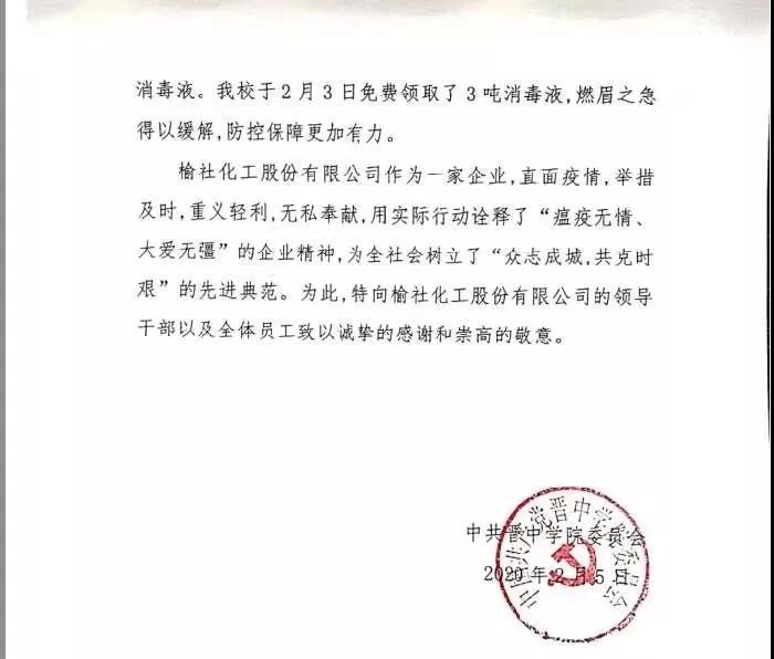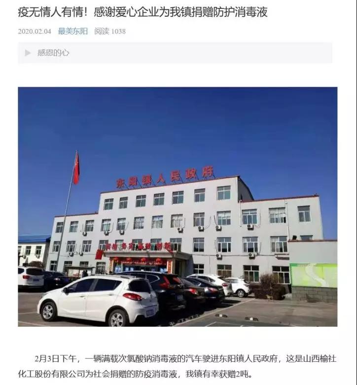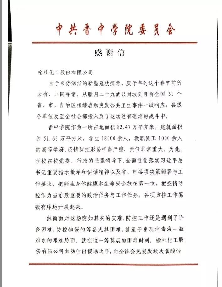 疫情無情,人間有愛。榆化公司于1月31日——2月11日共計(jì)為全省范圍內(nèi)357家單位捐贈(zèng)次氯酸鈉消毒液163.545噸。社會(huì)各界紛紛對(duì)榆化所為表示感謝,晉中市衛(wèi)生健康委員會(huì)、山西日?qǐng)?bào)、晉中市交通運(yùn)輸局、晉中市工商聯(lián)合會(huì)、新浪山西官媒紛紛發(fā)文對(duì)公司做出的義舉表示肯定。