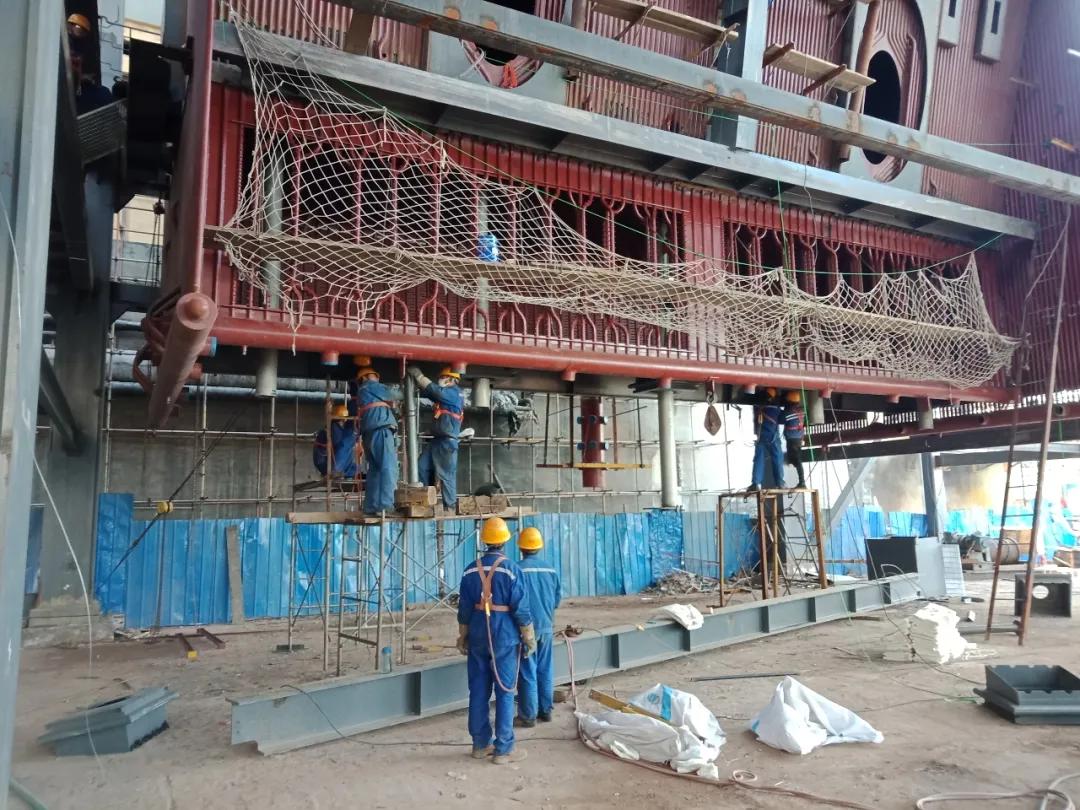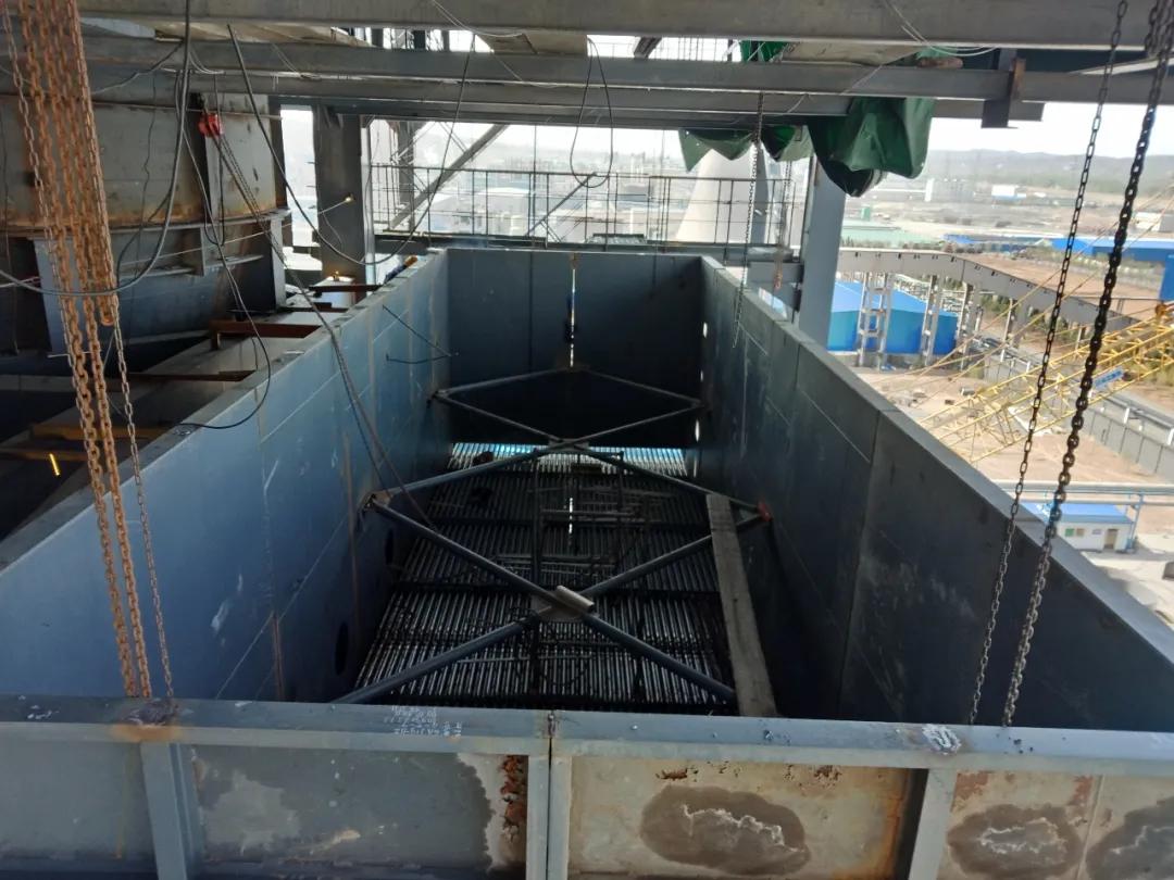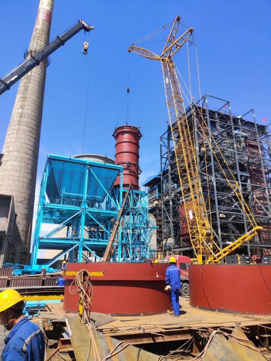 2#灰斗安裝就位,吸收塔直筒最后筒體起吊組裝。